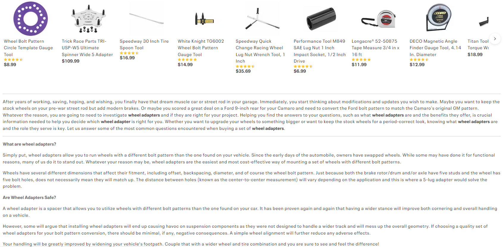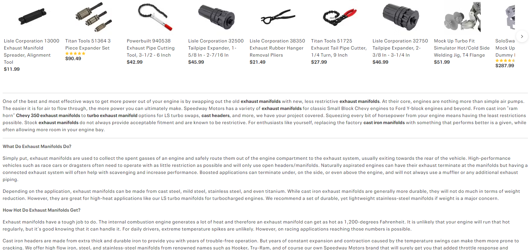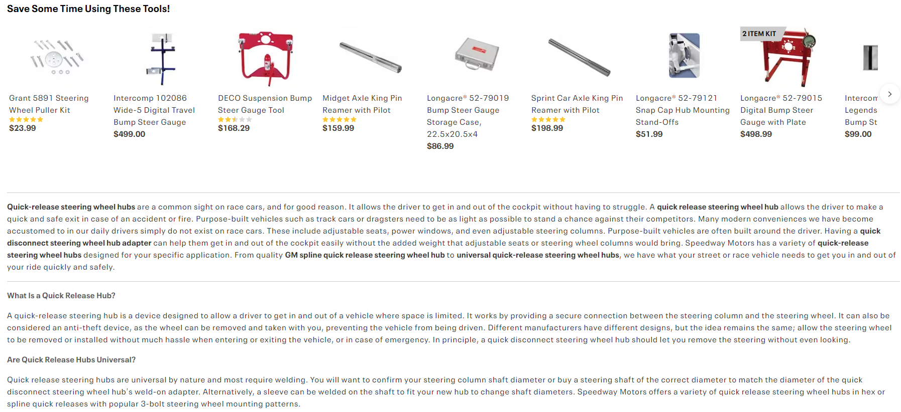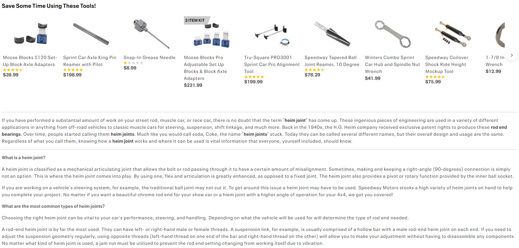 On top of that, our team worked closely with the senior editor at Speedway Motors to create SEO-rich landing pages for various categories, including headers, driveshafts, and brake lines. The goal was to inform the reader while also increasing SERP rankings.